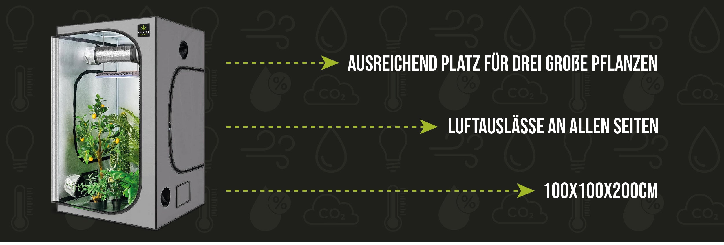 Die Growbox 100x100x200 ist eine beliebte Wahl für Grower, die etwas mehr Platz zur Verfügung haben und eine größere Anzahl von Pflanzen anbauen möchten. Mit ihren großzügigen Maßen bietet diese Growbox ausreichend Platz für eine Vielzahl von Pflanzen und ermöglicht eine optimale Verteilung von Licht und Belüftung. Diese Größe ist ideal für Grower, die sowohl in der vegetativen als auch in der Blütephase ihrer Pflanzen viel Raum benötigen.