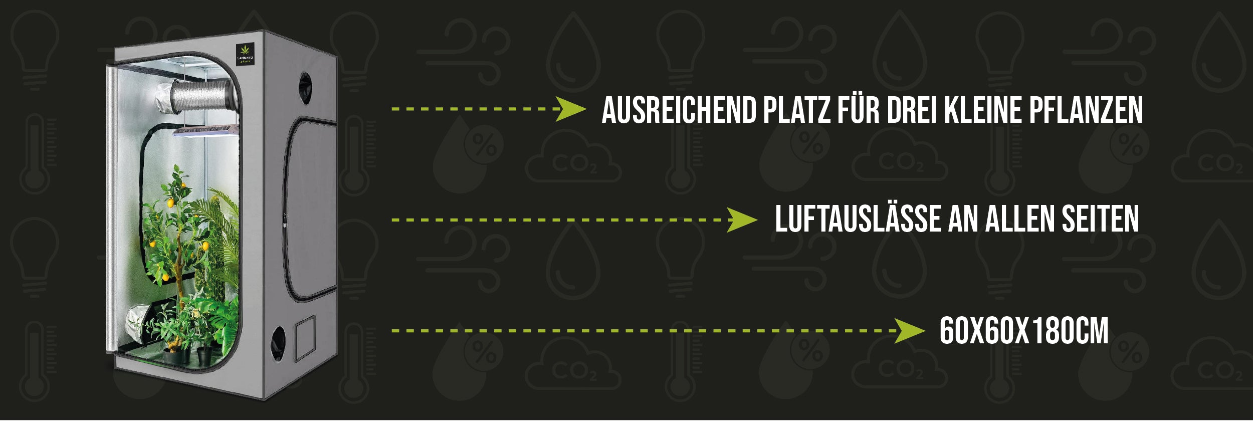 Die Growbox S bietet eine kompakte Grundfläche von nur 60x60 cm mit einer praktischen Höhe von 180 cm und ausreichend Platz für eine erfolgreiche Eigenversorgung.